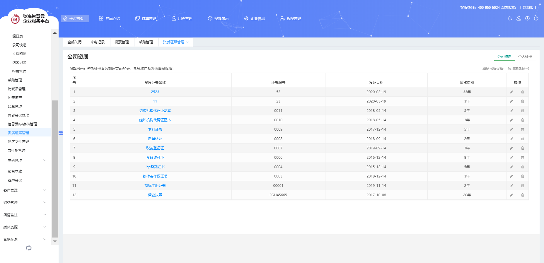 采購管理、資質證照管理