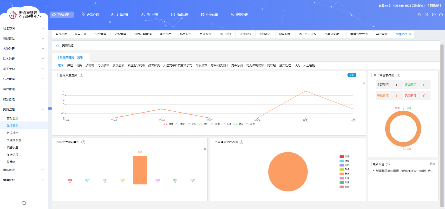 實時監測、關鍵詞設置、輿情概覽、數據報告、全網搜索、預警設置、發送記錄、我的收藏。